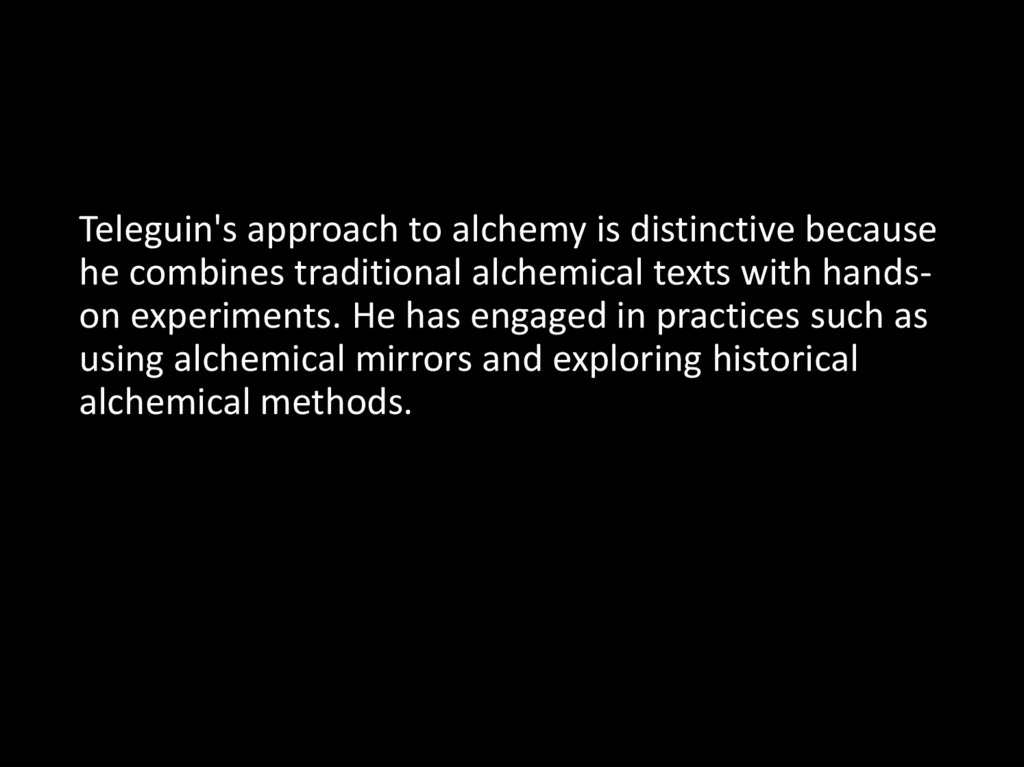 Teleguin's approach to alchemy is distinctive becausehe combines traditional alchemical texts with handson experiments. He has engaged in practices such as