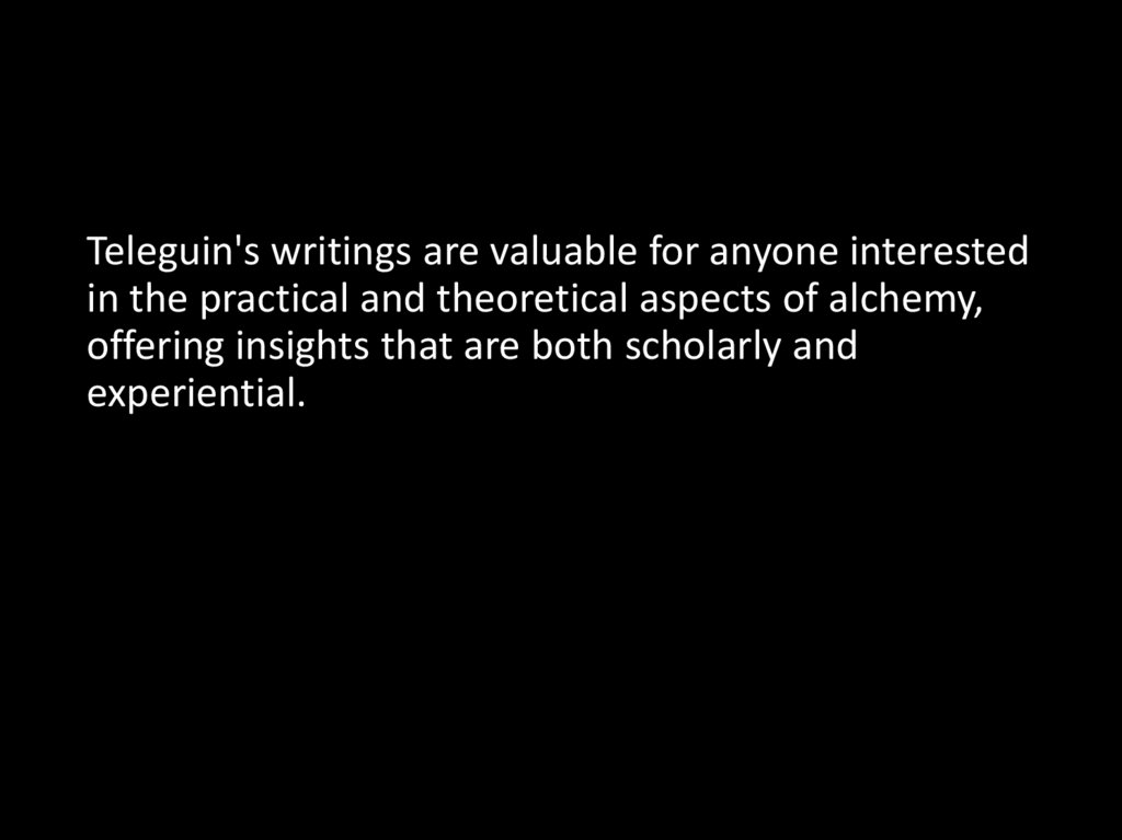 Teleguin's writings are valuable for anyone interestedin the practical and theoretical aspects of alchemy,