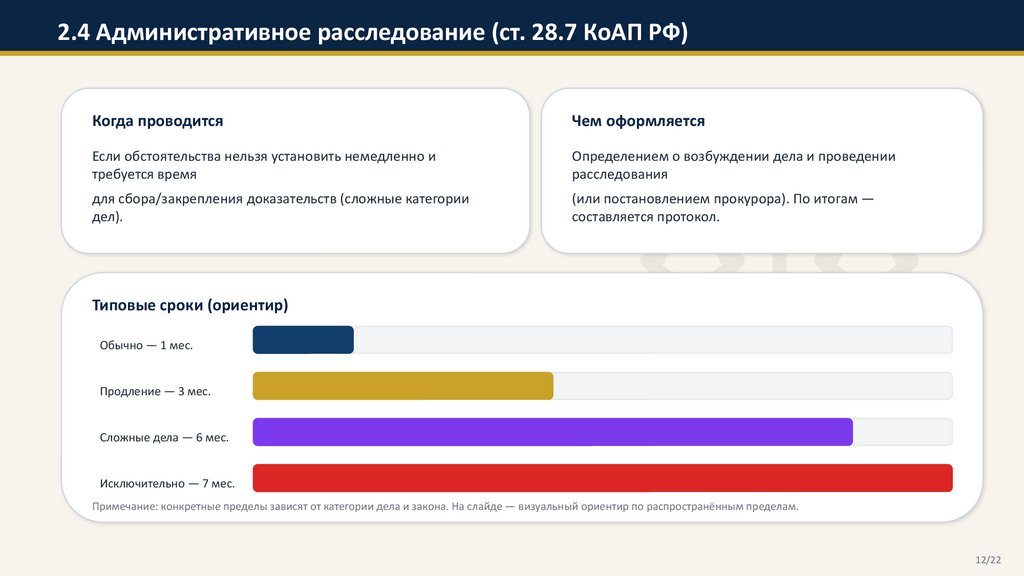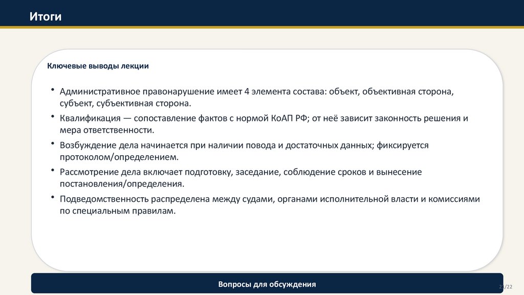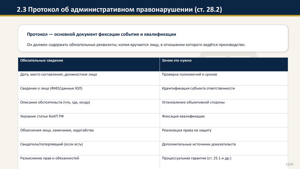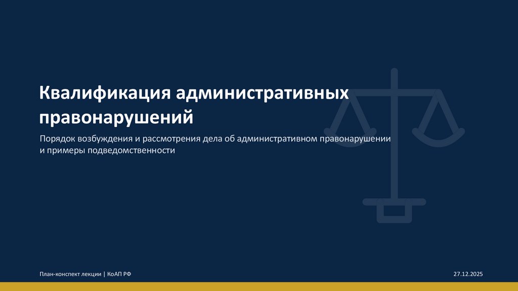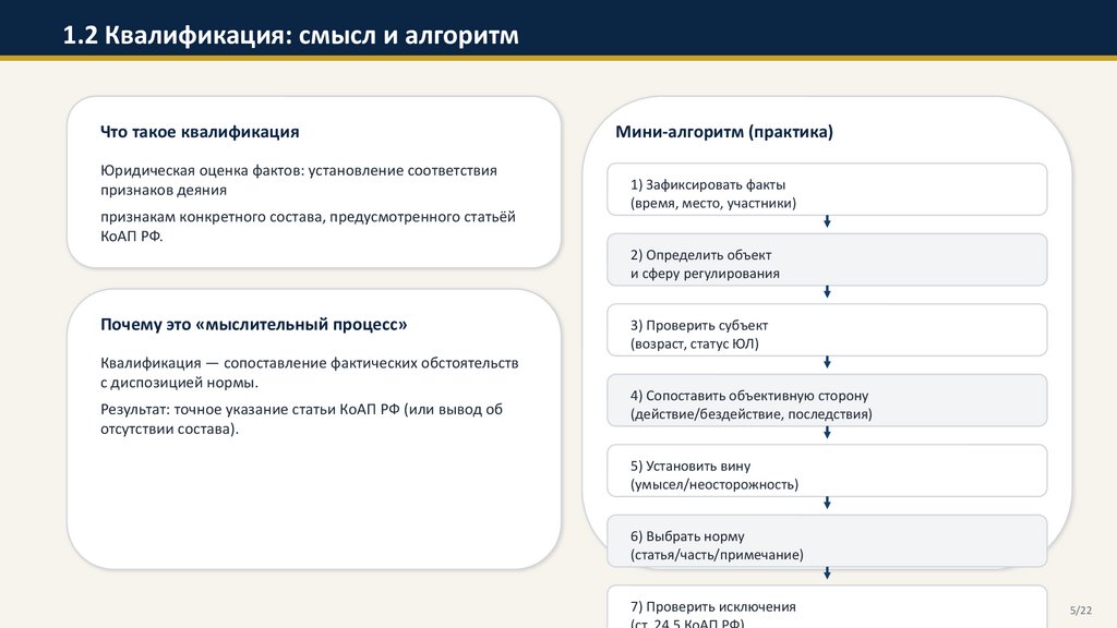 • Квалификация — сопоставление фактов с нормой КоАП РФ; от неё зависит законность решения и