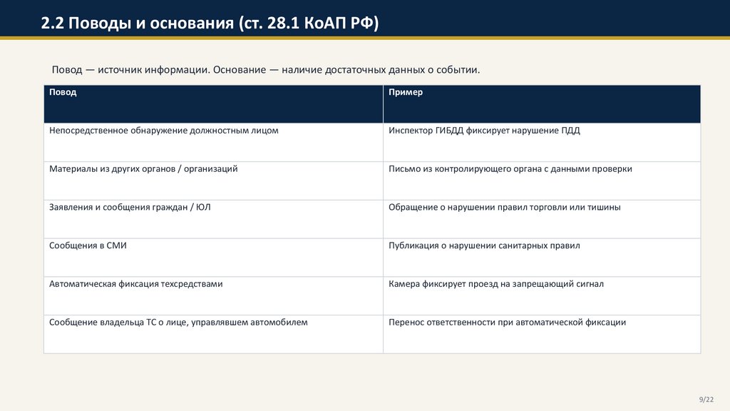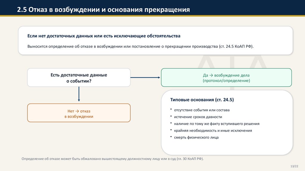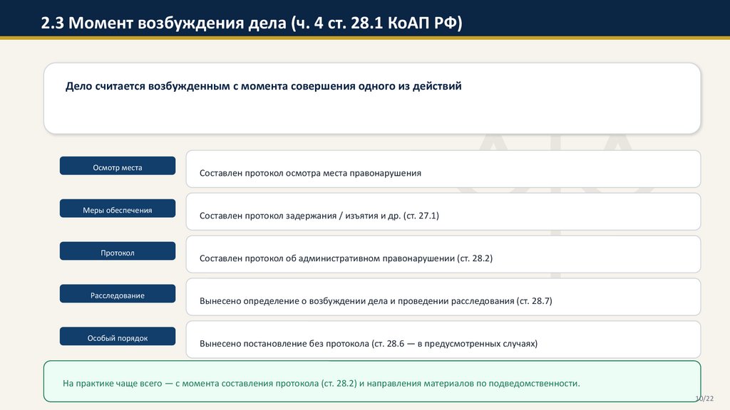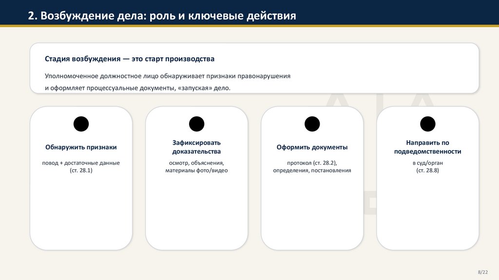 • Возбуждение дела начинается при наличии повода и достаточных данных; фиксируется