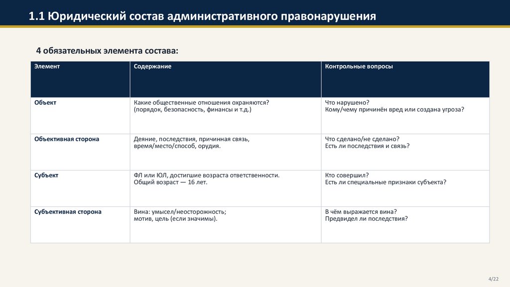 1.1 Юридический состав административного правонарушения4 обязательных элемента состава: