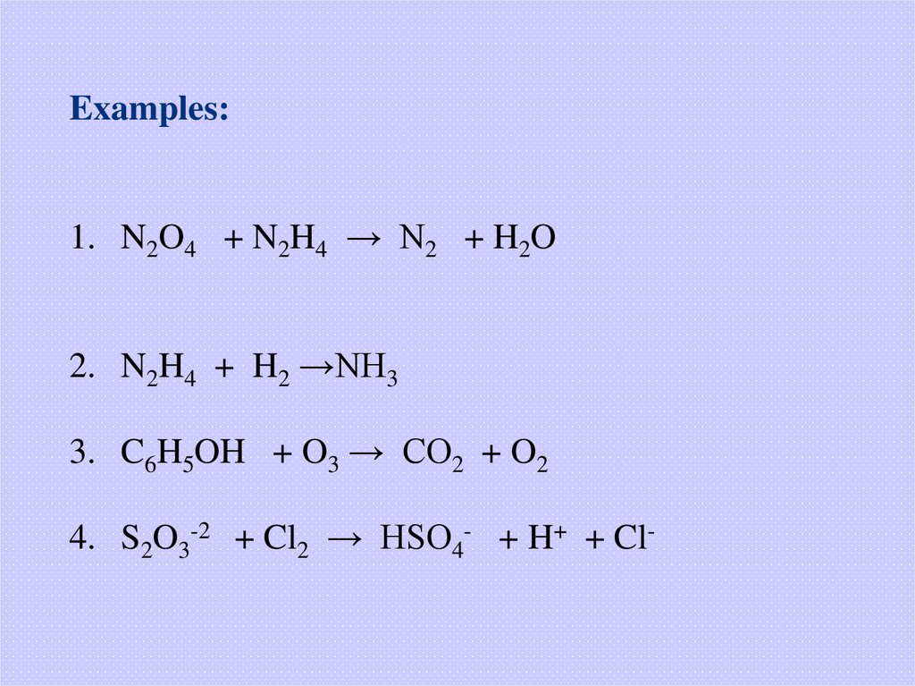 Examples:1. N2O4 + N2H4 → N2 + H2O
