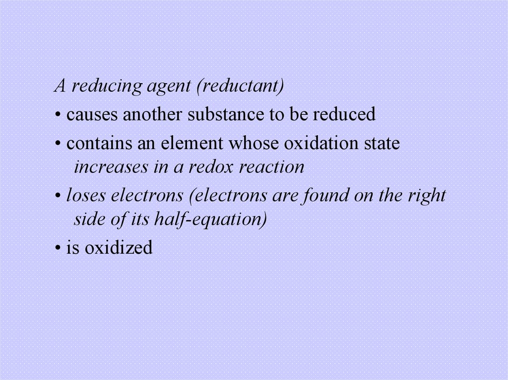 An oxidizing agent (oxidant)• causes another substance to be oxidized