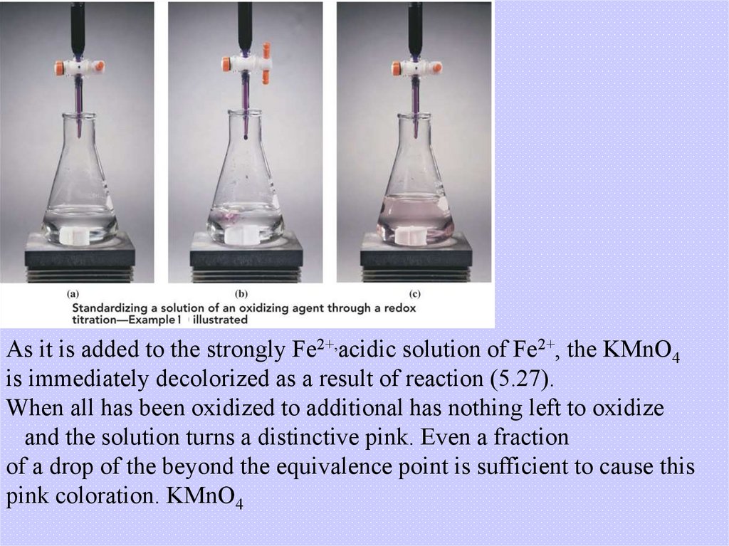 As it is added to the strongly Fe2+,acidic solution of Fe2+, the KMnO4is immediately decolorized as a result of reaction (5.27).