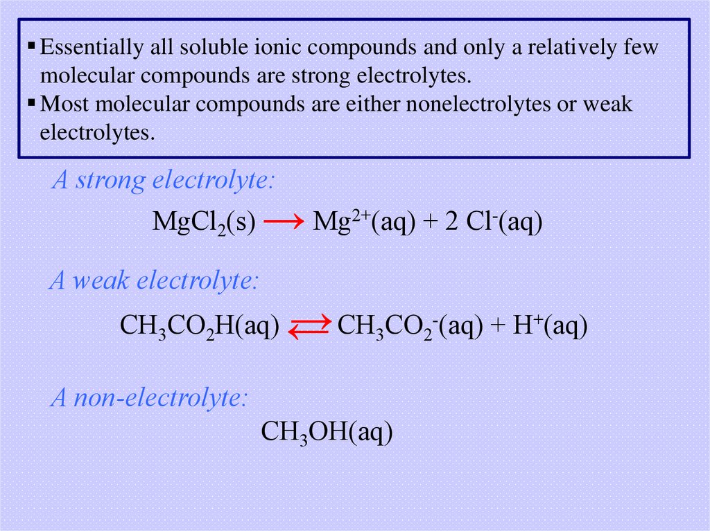 Essentially all soluble ionic compounds and only a relatively fewmolecular compounds are strong electrolytes.