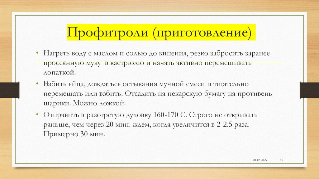 Профитроли (приготовление)• Нагреть воду с маслом и солью до кипения, резко забросить заранее