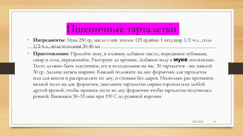 Пшеничные тарталетки• Ингредиенты: Мука 250 гр, масло слив. теплое 125 гр,яйцо 1 шт,сахар 1/2 ч.л., соль