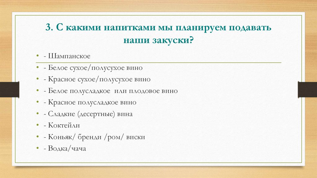 3. С какими напитками мы планируем подаватьнаши закуски?