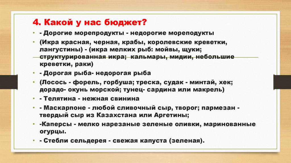 4. Какой у нас бюджет?• - Дорогие морепродукты - недорогие мореподукты