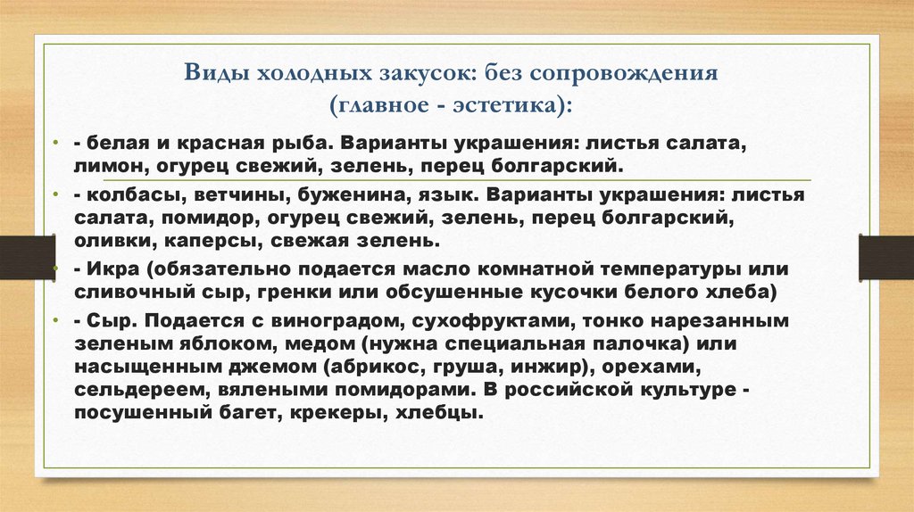 Виды холодных закусок: без сопровождения(главное - эстетика):