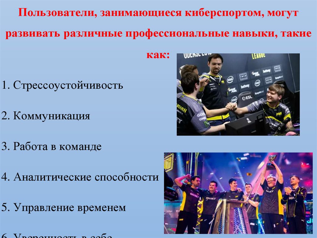 Пользователи, занимающиеся киберспортом, могутразвивать различные профессиональные навыки, такие