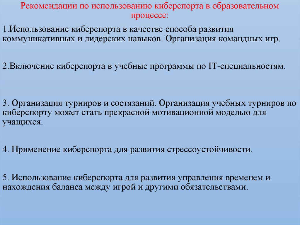 Рекомендации по использованию киберспорта в образовательномпроцессе: