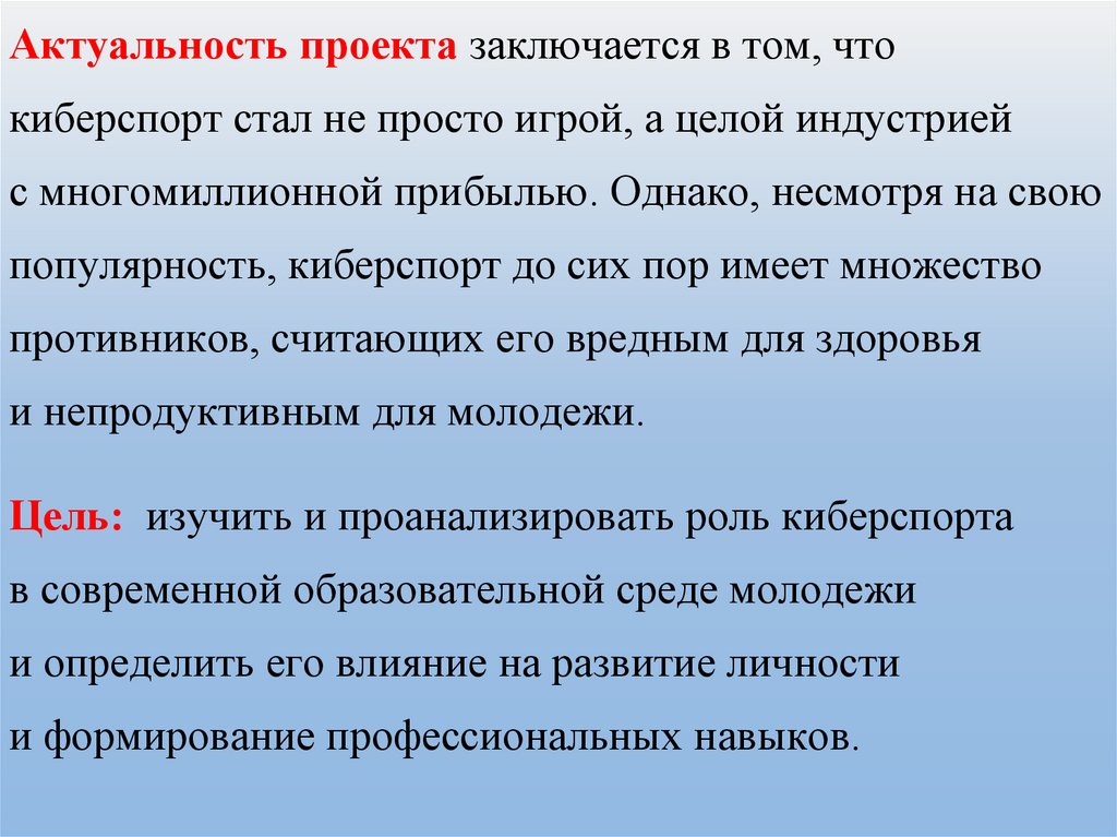 Актуальность проекта заключается в том, чтокиберспорт стал не просто игрой, а целой индустрией
