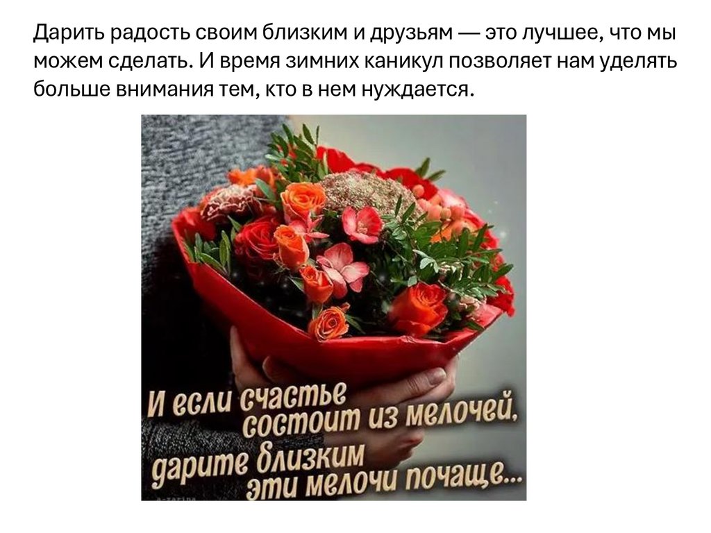 Дарить радость своим близким и друзьям — это лучшее, что мыможем сделать. И время зимних каникул позволяет нам уделять