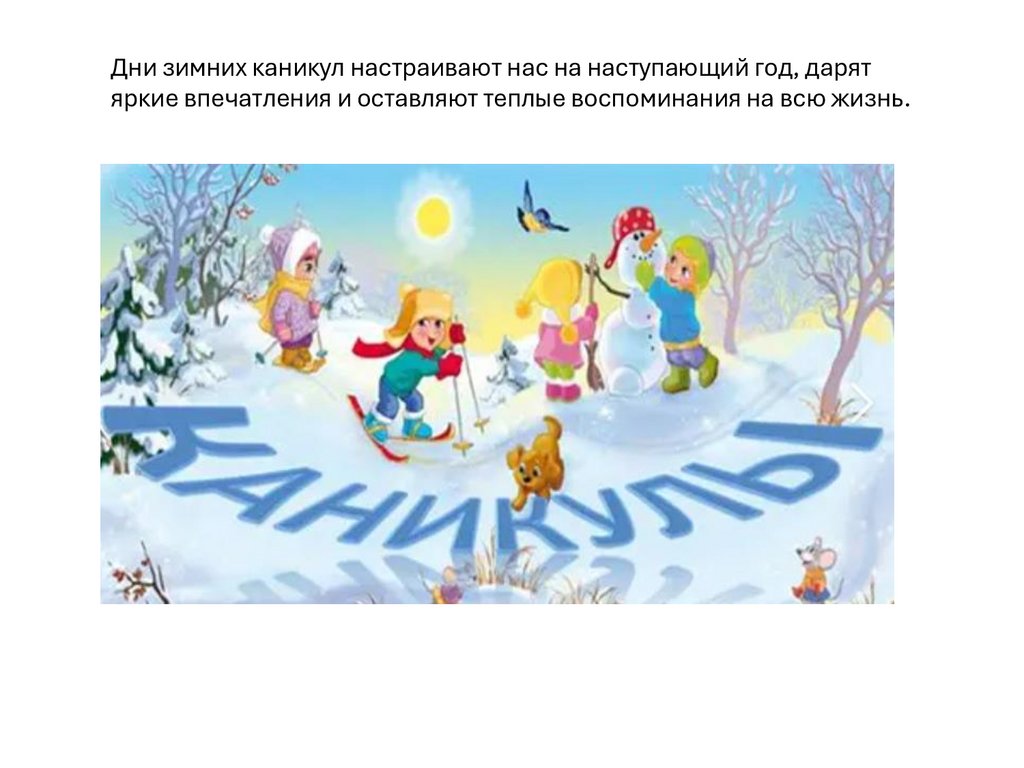 Дни зимних каникул настраивают нас на наступающий год, дарятяркие впечатления и оставляют теплые воспоминания на всю жизнь.