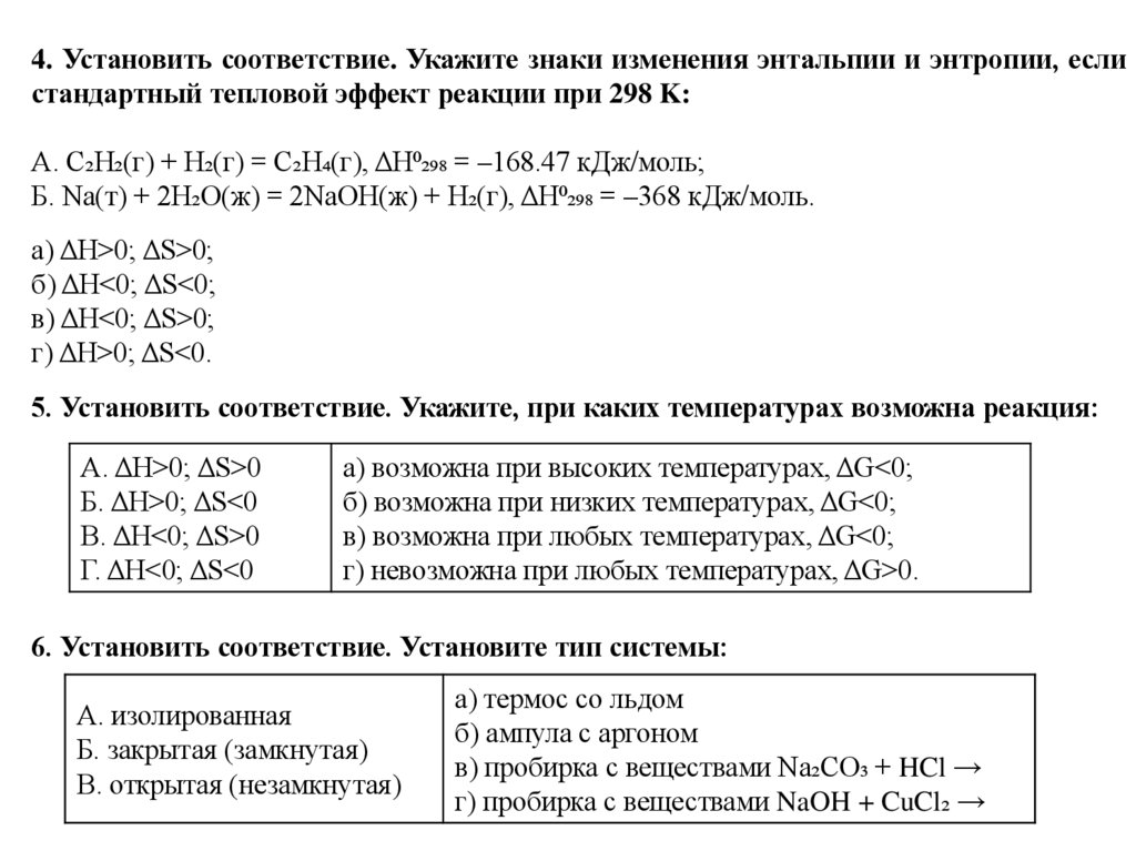 4. Установить соответствие. Укажите знаки изменения энтальпии и энтропии, еслистандартный тепловой эффект реакции при 298 K: