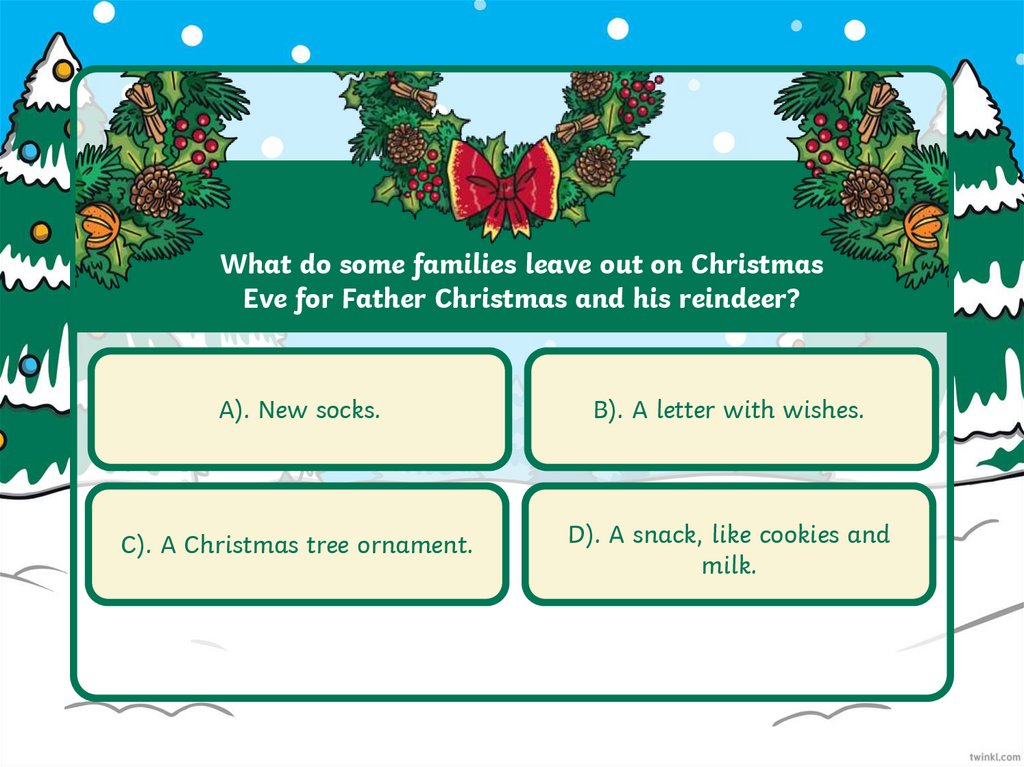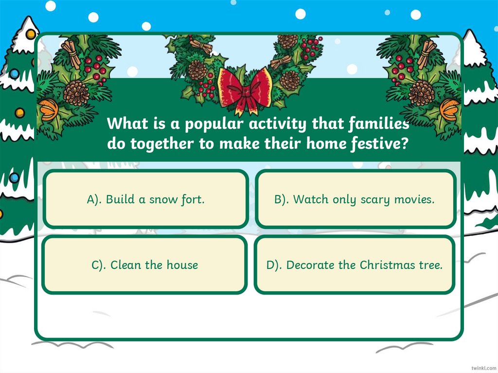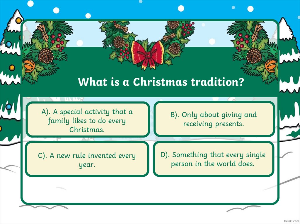 What is a Christmas tradition?A). A special activity that a