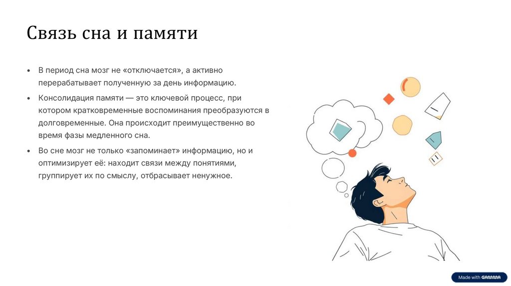 Связь сна и памяти• В период сна мозг не «отключается», а активно
