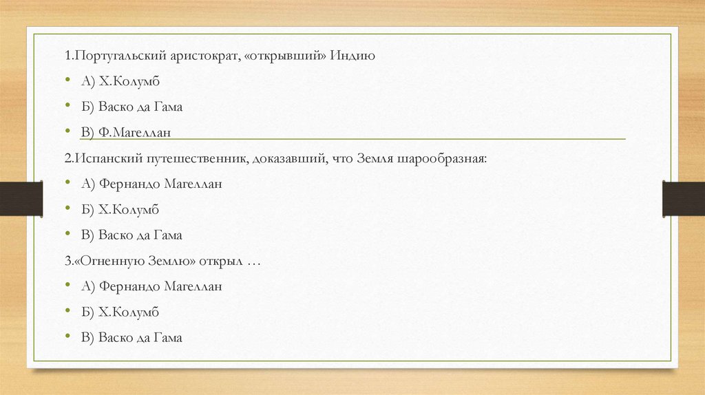 1.Португальский аристократ, «открывший» Индию• А) Х.Колумб