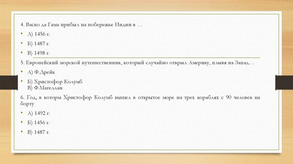 4. Васко да Гама прибыл на побережье Индии в …• А) 1456 г.