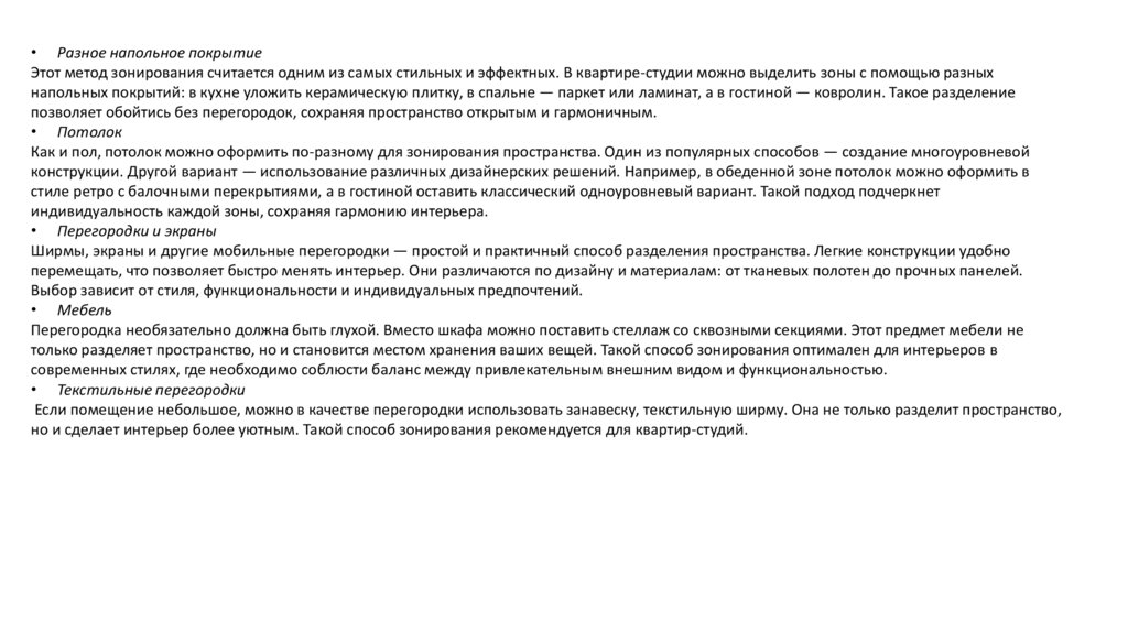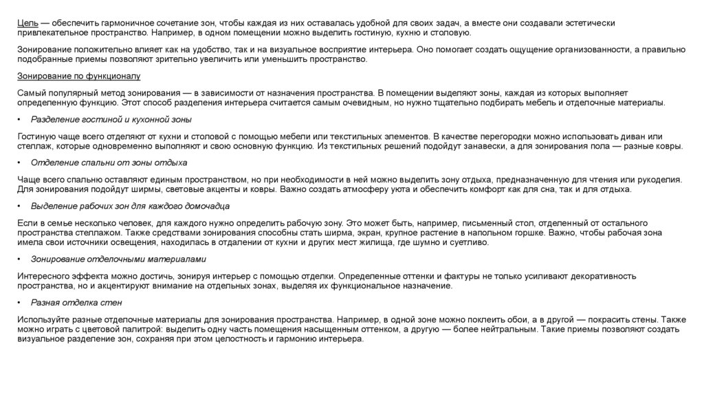 Цель — обеспечить гармоничное сочетание зон, чтобы каждая из них оставалась удобной для своих задач, а вместе они создавали эстетическипривлекательное пространство. Например, в одном помещении можно выделить гостиную, кухню и столовую.
