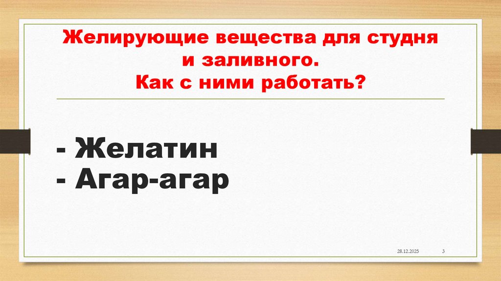 • ВТОРОСТЕПЕННЫЕ ПЕРЕД ЖЕЛИРОВАНИЕМ: желатин(агар) - если нужно,