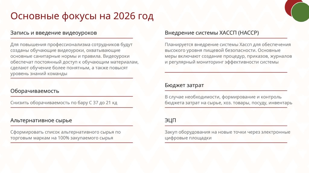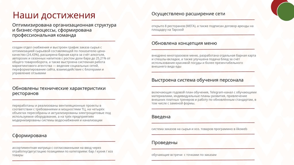 оптимизацией сырьевой составляющей по показателю ценакачество (24,43%), расширена барная карта за счёт алкоголя,