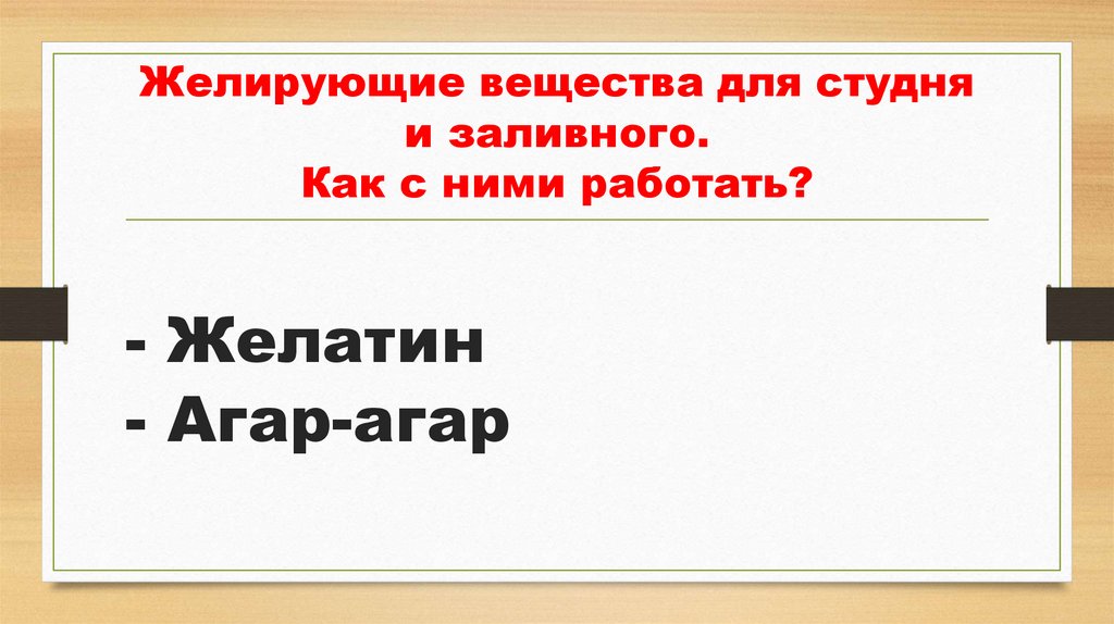 • ВТОРОСТЕПЕННЫЕ ПЕРЕД ЖЕЛИРОВАНИЕМ: желатин(агар) - если нужно,