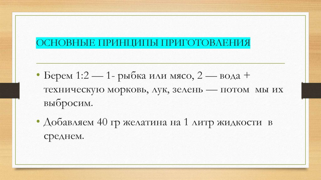 ОСНОВНЫЕ ПРИНЦИПЫ ПРИГОТОВЛЕНИЯ• Берем 1:2 — 1- рыбка или мясо, 2 — вода +