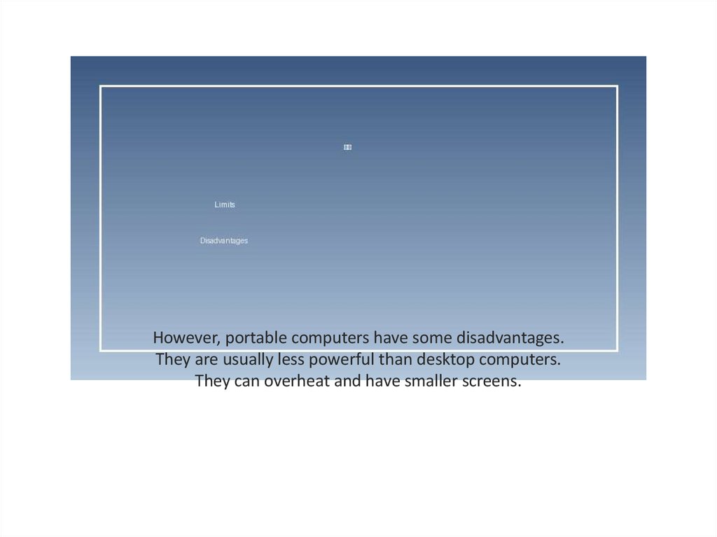 However, portable computers have some disadvantages.They are usually less powerful than desktop computers.