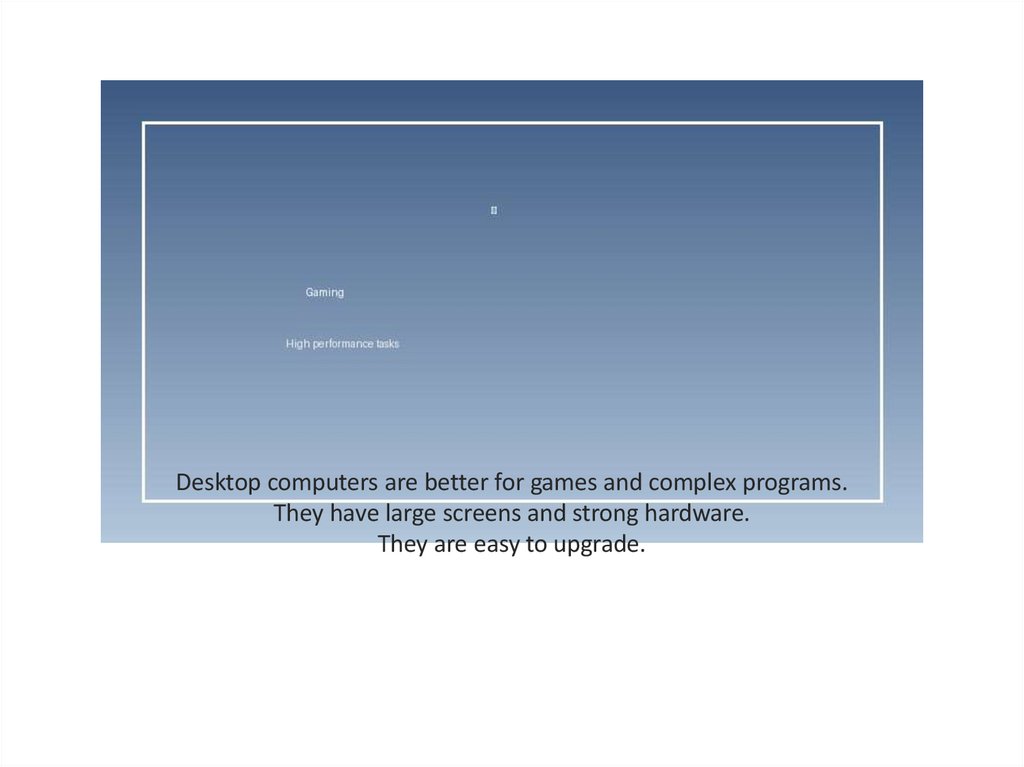 Desktop computers are better for games and complex programs.They have large screens and strong hardware.