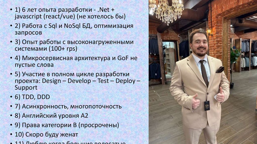 • 1) 6 лет опыта разработки - .Net +javascript (react/vue) (не хотелось бы)