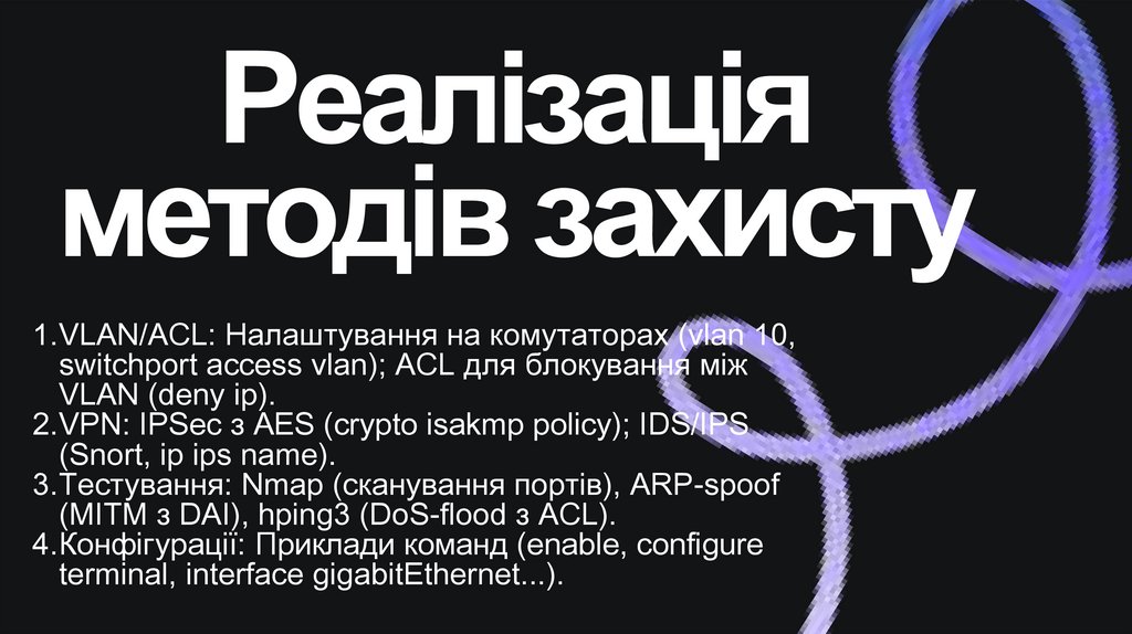 (MITM з DAI), hping3 (DoS-flood з ACL).
