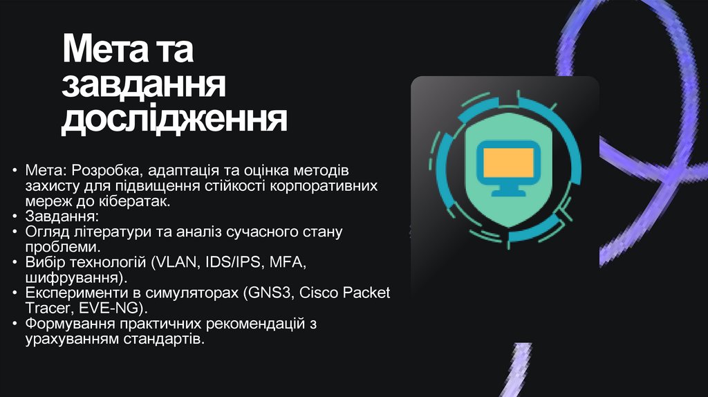 • Вибір технологій (VLAN, IDS/IPS, MFA,