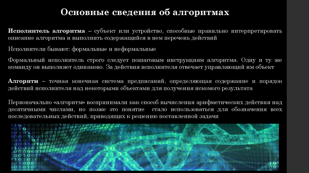 Основные сведения об алгоритмахИсполнитель алгоритма – субъект или устройство, способные правильно интерпретировать