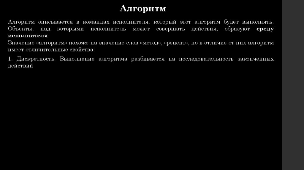 1. Дискретность. Выполнение алгоритма разбивается на последовательность законченных