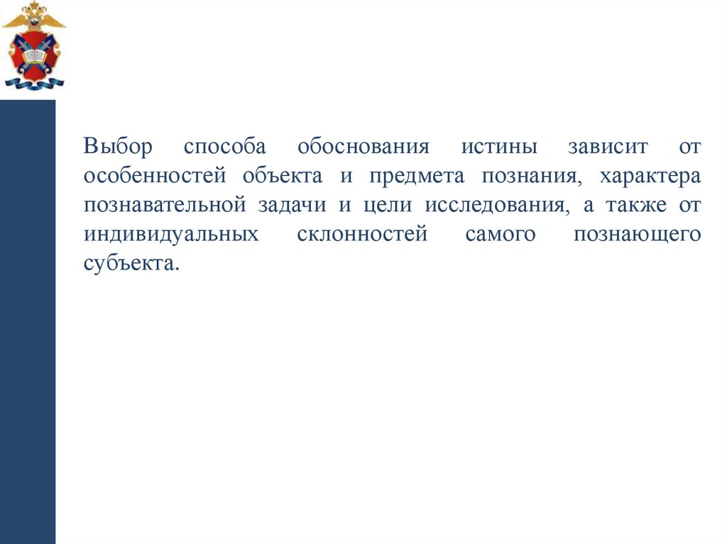 Выбор способа обоснования истины зависит отособенностей объекта и предмета познания, характера
