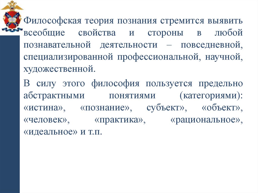 Философская теория познания стремится выявитьвсеобщие свойства и стороны в любой