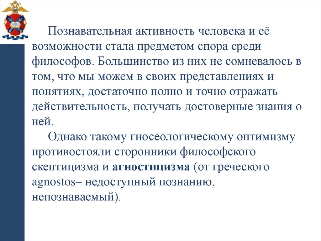 Познавательная активность человека и еёвозможности стала предметом спора среди