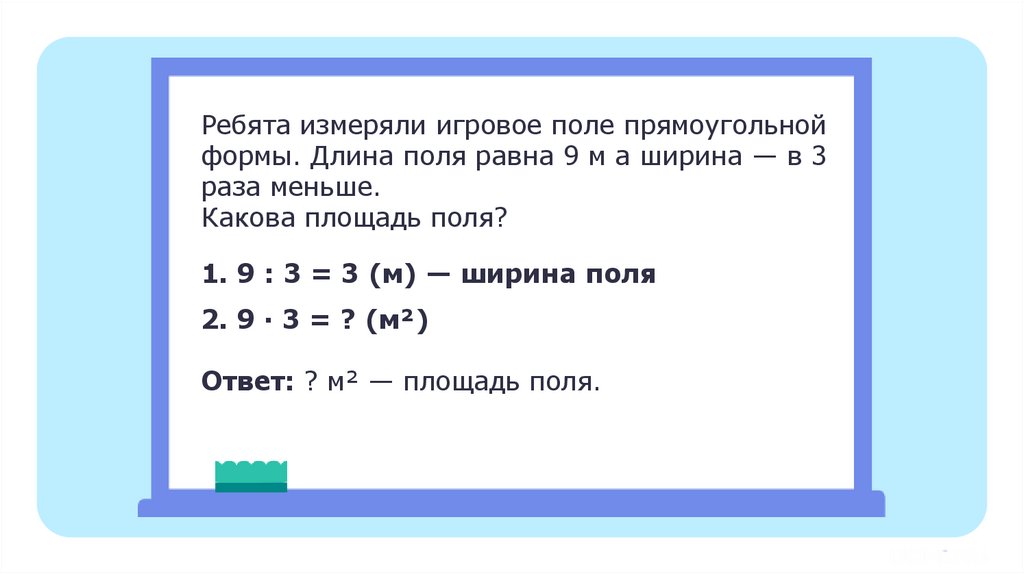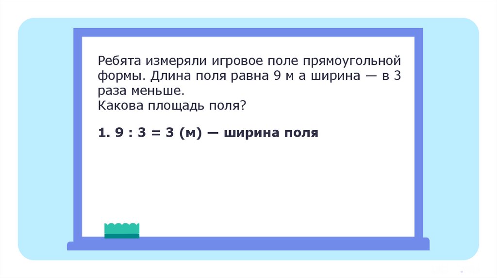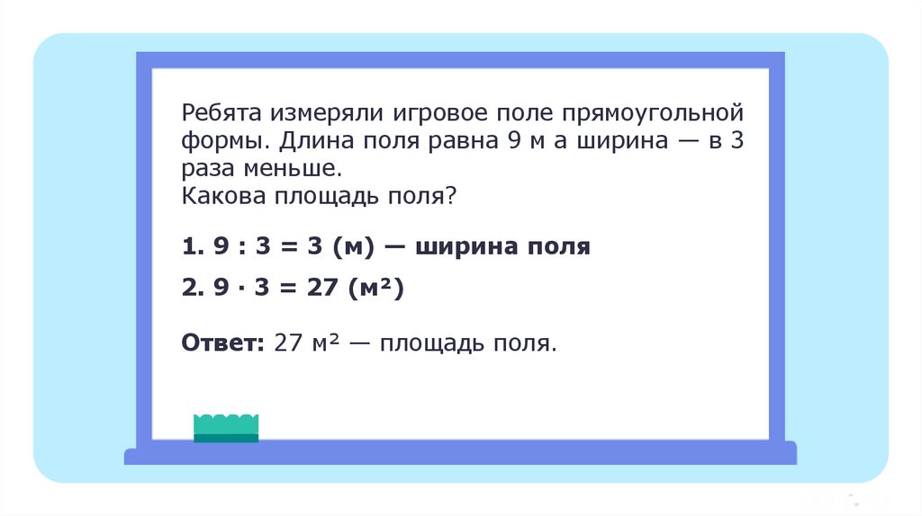 Ребята измеряли игровое поле прямоугольнойформы. Длина поля равна 9 м а ширина — в 3