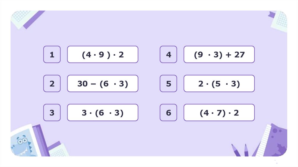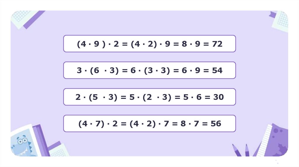 (4 · 9 ) · 2 = (4 · 2) · 9 = 8 · 9 = 723 · (6 · 3) = 6 · (3 · 3) = 6 · 9 = 54
