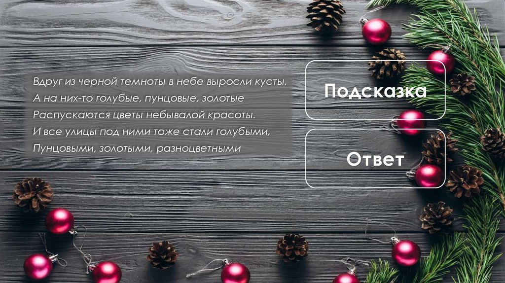 Вдруг из черной темноты в небе выросли кусты.А на них-то голубые, пунцовые, золотые