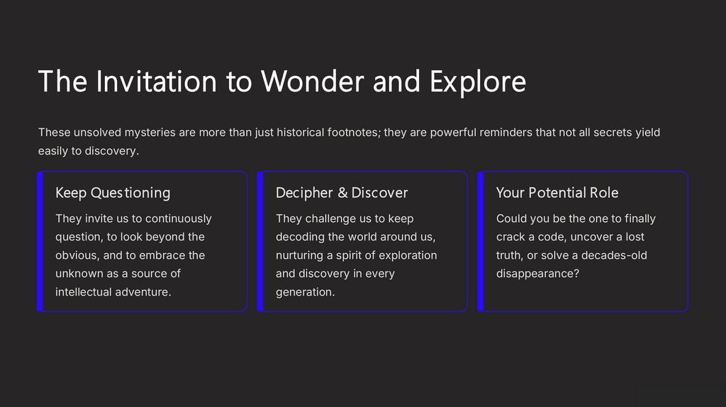 The Invitation to Wonder and ExploreThese unsolved mysteries are more than just historical footnotes; they are powerful reminders that not all secrets yield
