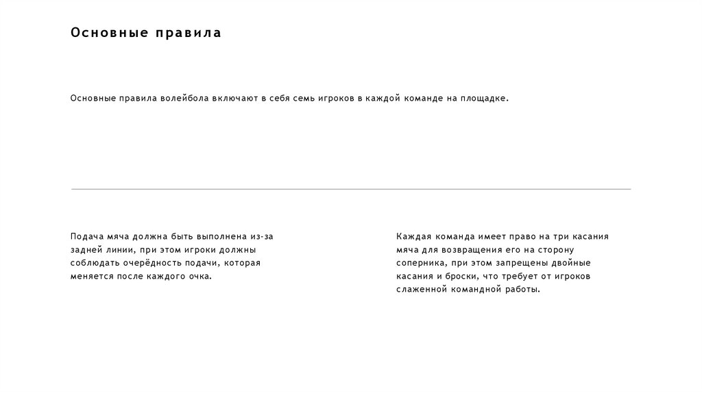 Основные правилаОсновные правила волейбола включают в себя семь игроков в каждой команде на площадке.
