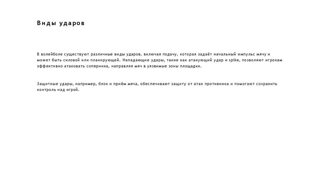 Виды ударовВ волейболе существуют различные виды ударов, включая подачу, которая задаёт начальный импульс мячу и