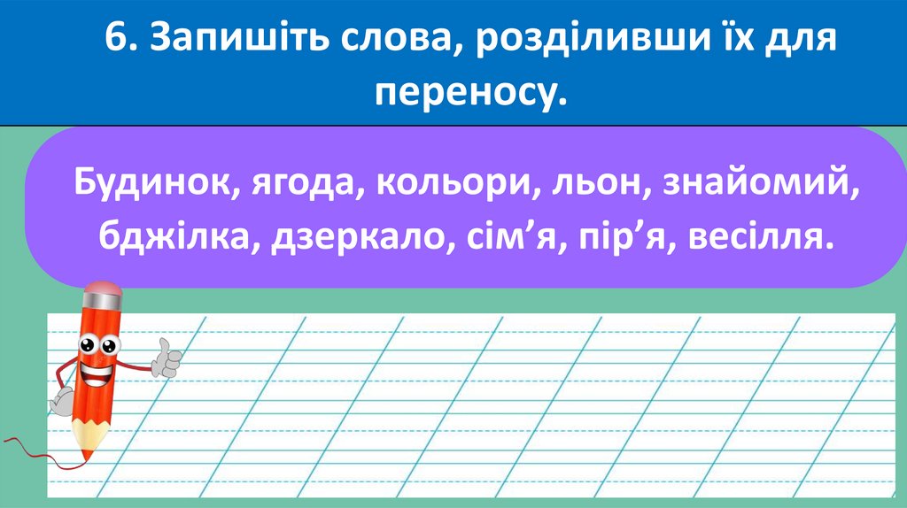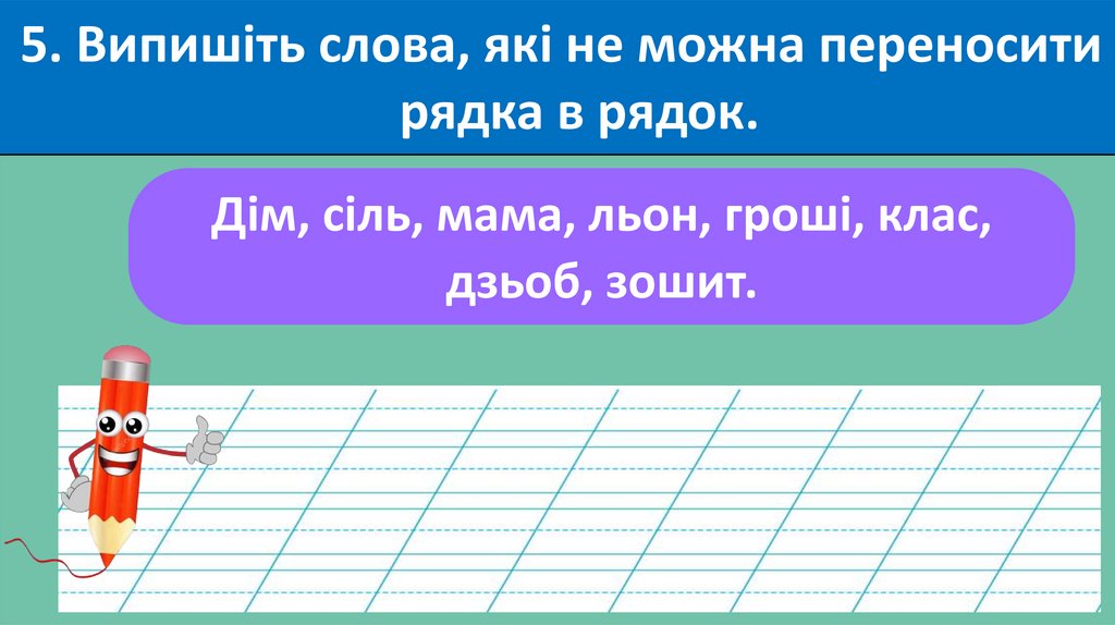 5. Випишіть слова, які не можна переносити зрядка в рядок.