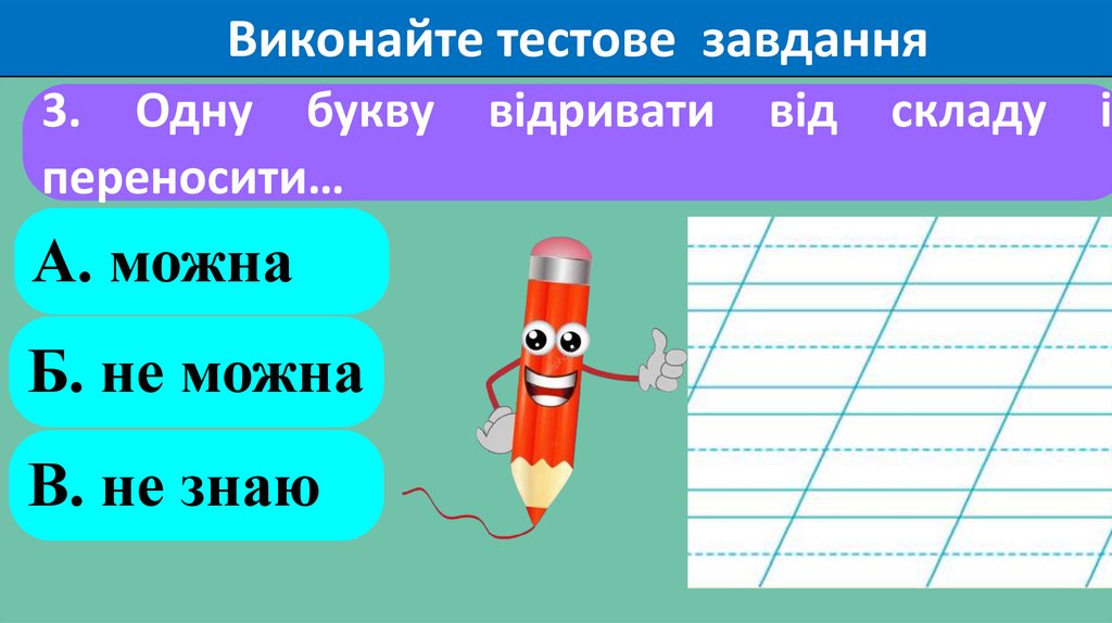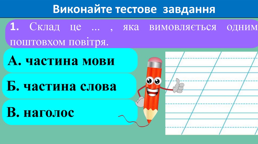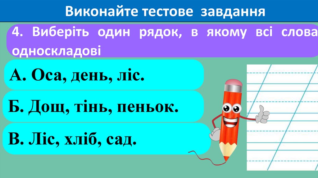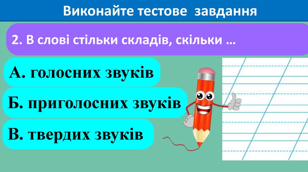 Виконайте тестове завдання2. В слові стільки складів, скільки …
