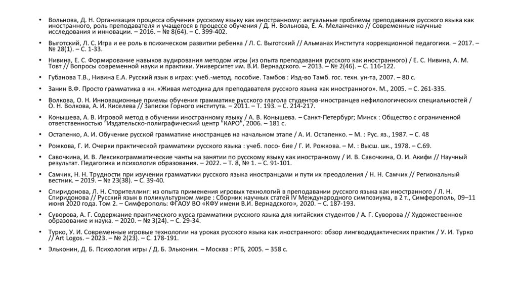 • Азарина, Л. Е. Игры на уроках РКИ / Л. Е. Азарина // Вестник Центра международного образования Московскогогосударственного университета. Филология. Культурология. Педагогика. Методика. – 2009. – № 3. – С. 102-109.