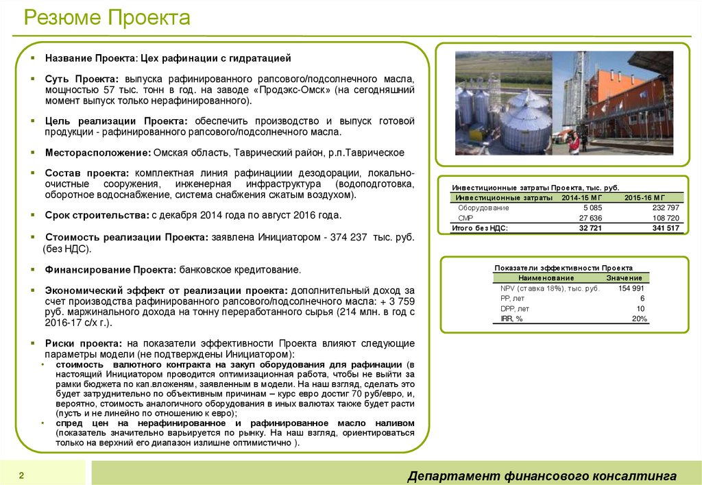Строительство Цеха рафинации с линией гидратации позволит осуществить выпуск более маржинального продукта рафинированного дезодорированного масла (дополнительная маржинальная доходность на 1 тн. сырья –3 759 руб.).Показатели Проекта: