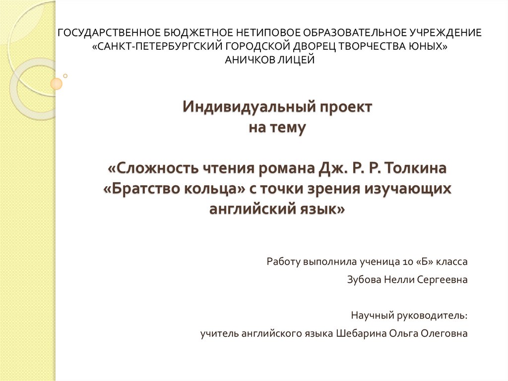 1. Индивидуальный проект на тему «Сложность чтения романа Дж. Р. Р. Толкина «Братство кольца» с точки зрения изучающих английский